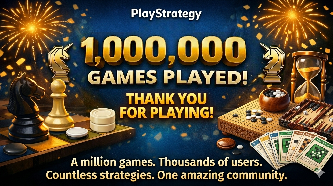 PlayStrategy is a real-time platform to play two-player Mind Sports board games. Over 30 different games available including Chess, Go, Othello, Mancala, Draughts... on this free and open-source site. About PlayStrategy...