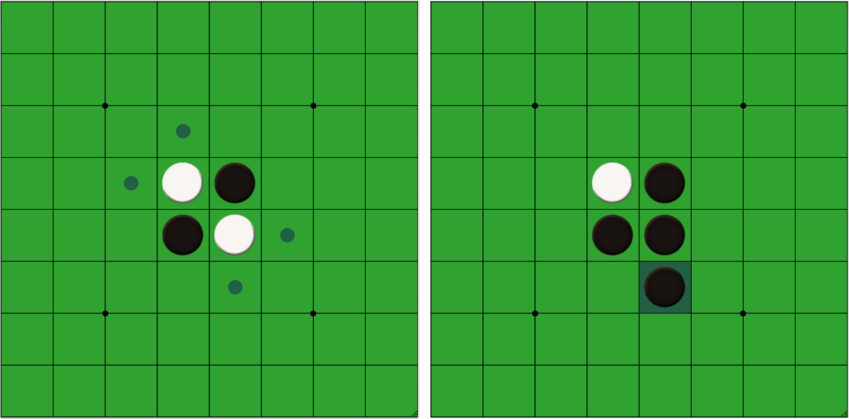 For example at the start of the game you have 4 possible moves as highlighted below on the left, and the result of a possible first move can be seen on the right.